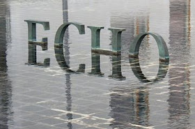Mitt i den andra bildas ordet ECHO av halva bokstäver, som reflekteras i vattnet och blir helt.
